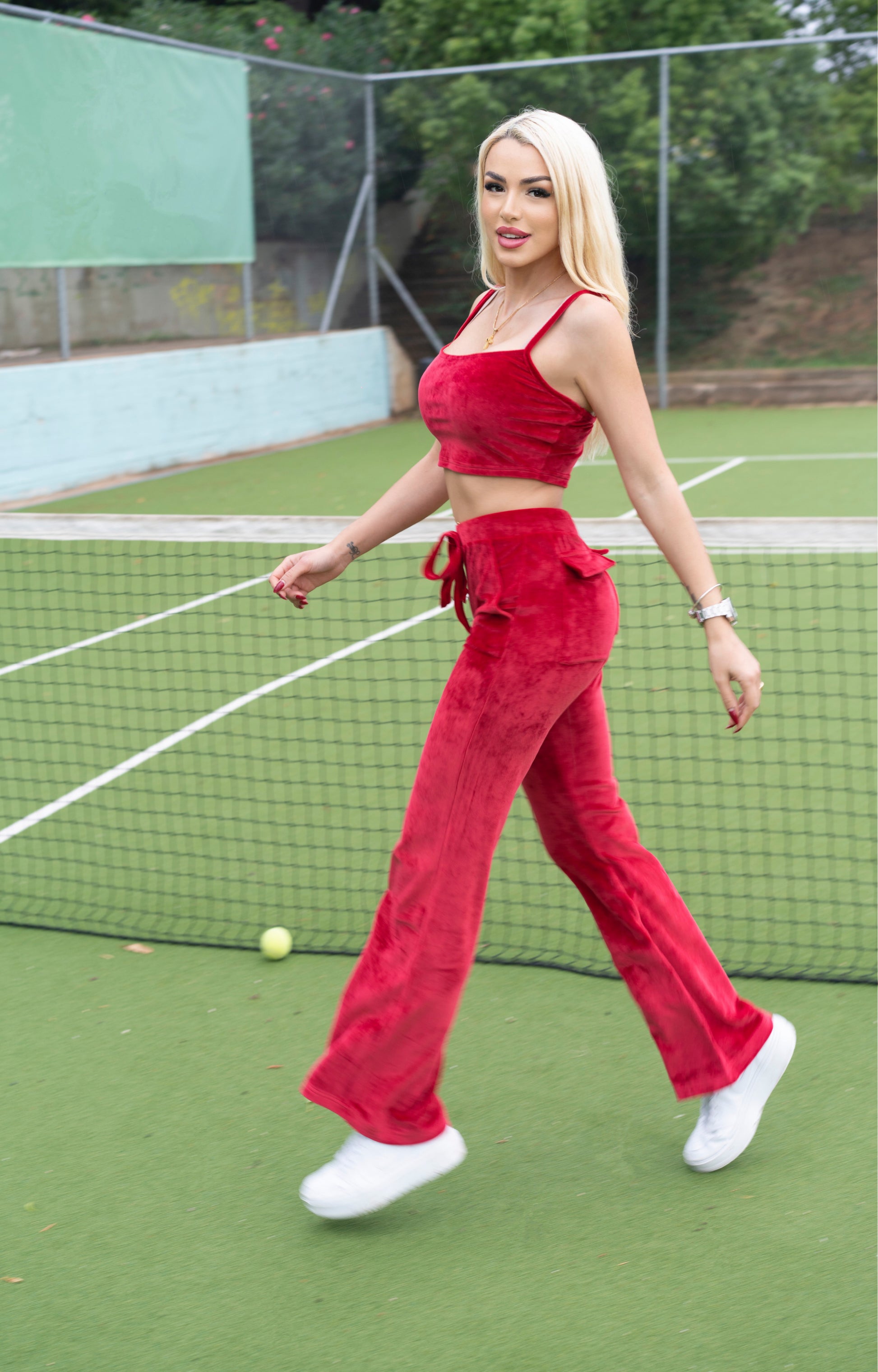 Στενή ελαστική βελούδινη φόρμα. Έχει τσέπες μπροστά και πίσω και λάστιχο και κορδόνι στην μέση. Είναι πολύ άνετη και συνδυάζεται με την ste και την angelic ζακέτα.