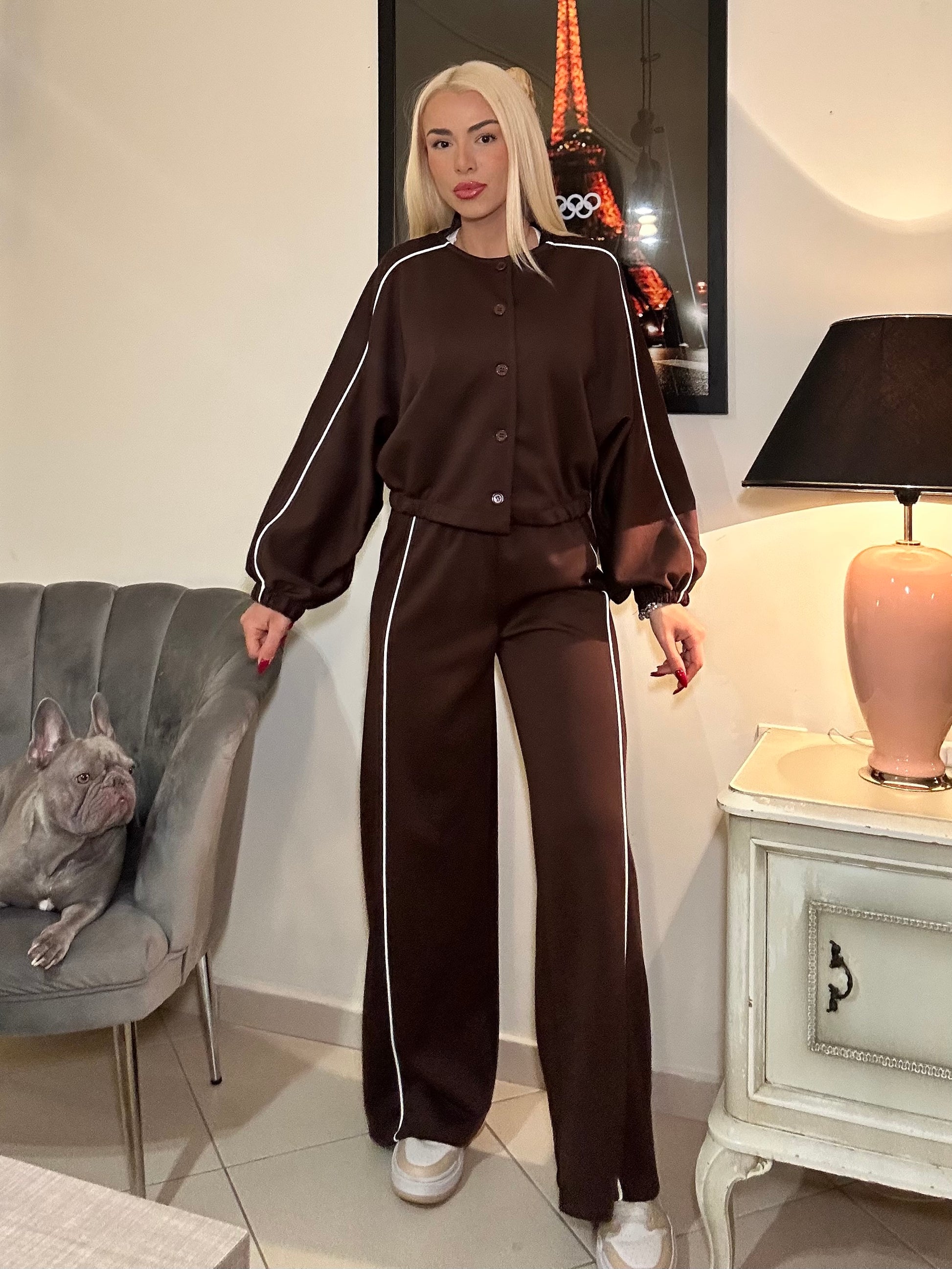 Η ζακέτα έχει oversized γραμμή, μαλακή υφή, κουμπώνει μπροστά με κουμπιά και διαθέτει λάστιχο στο τελείωμα και στους καρπούς για τέλεια εφαρμογή. Το παντελόνι είναι wide leg με λάστιχο στη μέση για άνεση και ευελιξία στην κίνηση, ενώ οι διακριτικές λευκές ρίγες σε όλο το σετ δίνουν statement χαρακτήρα και σμιλεύουν τη σιλουέτα.