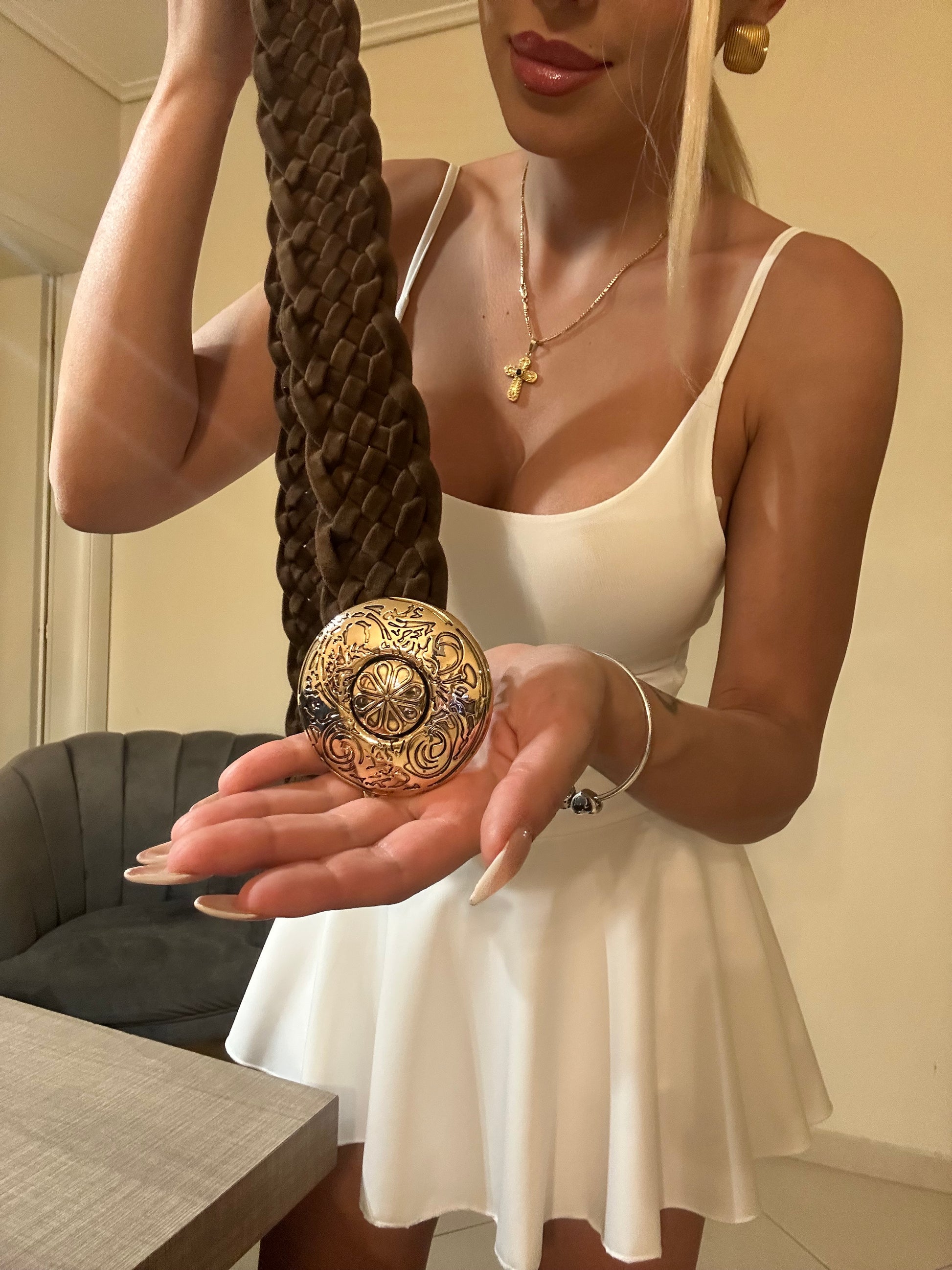 Η Dakota Belt συνδυάζει το western glam με vintage δυναμισμό. Κατασκευασμένη από πλεχτό suede ύφασμα και εντυπωσιακή μεταλλική αγκράφα, τονίζει υπέροχα τη μέση και αναβαθμίζει κάθε outfit – είτε τη φορέσεις πάνω από φόρεμα, φούστα ή τζιν πουκάμισο.