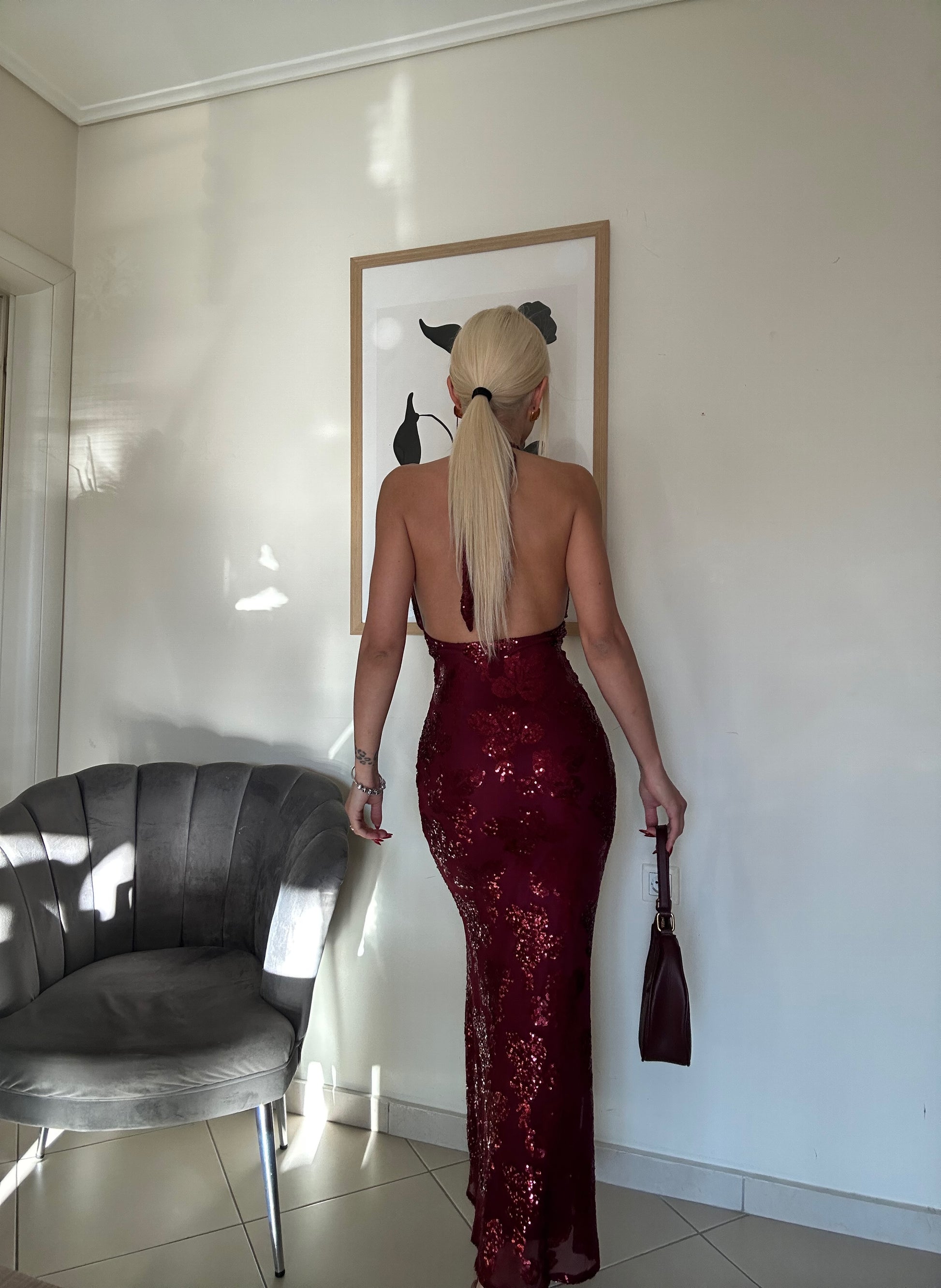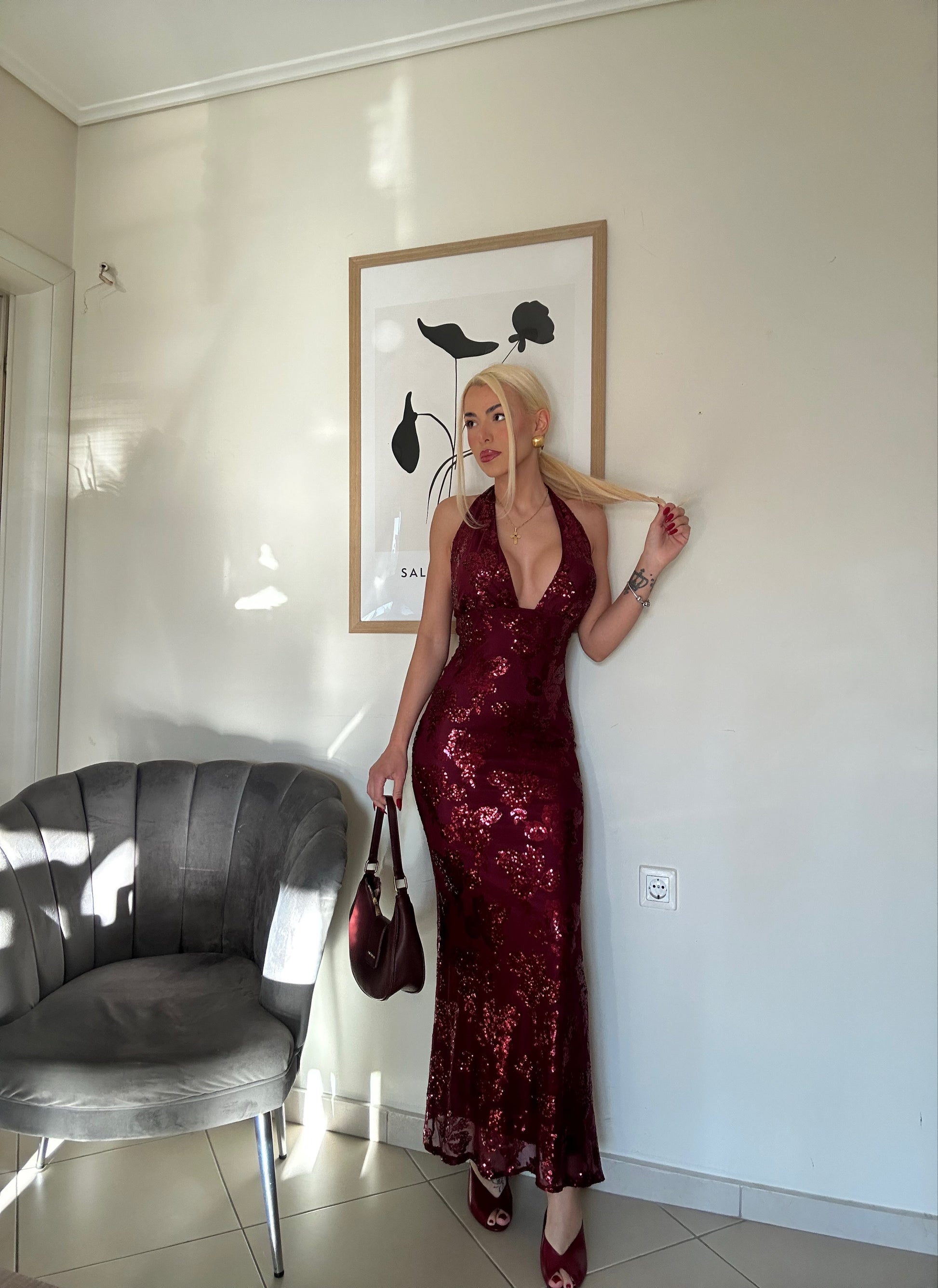 Με εντυπωσιακή halterneck λαιμόκοψη που δένει πίσω στον λαιμό και ανοιχτή πλάτη, το φόρεμα αποπνέει κομψότητα και σαγήνη, ιδανικό για βραδινές εμφανίσεις, γάμους ή ιδιαίτερες περιστάσεις.