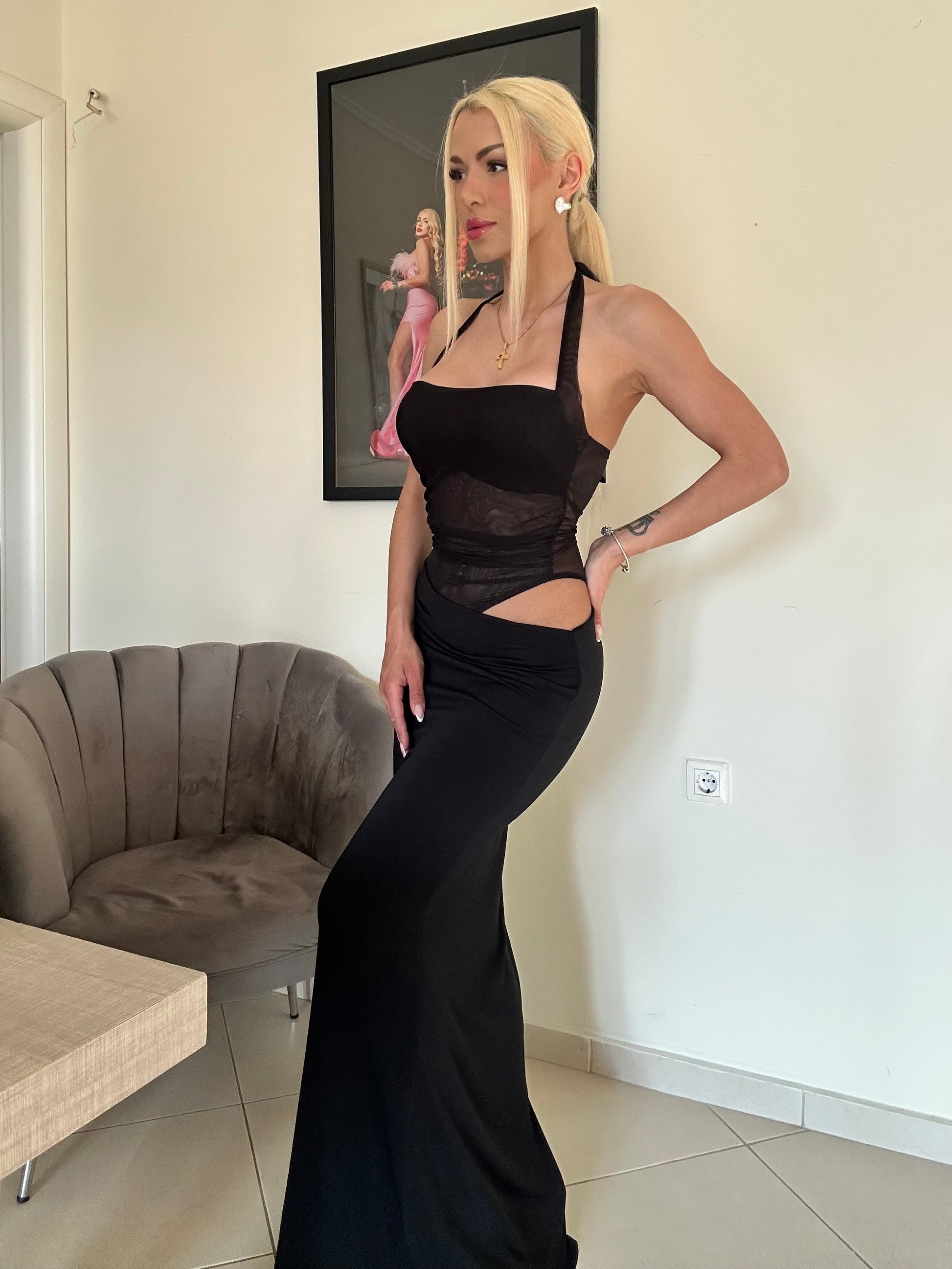 Το Halo Bonita είναι το μάξι φόρεμα που συνδυάζει αιθέρια κομψότητα με αισθησιακή δύναμη. Το επάνω μέρος από ημιδιάφανο ελαστικό τούλι αγκαλιάζει θηλυκά το μπούστο, ενώ τα ενσωματωμένα cups και το δέσιμο στον λαιμό σου επιτρέπουν να το ρυθμίσεις ακριβώς όπως θέλεις — για τέλεια εφαρμογή και μοναδικό στιλ.