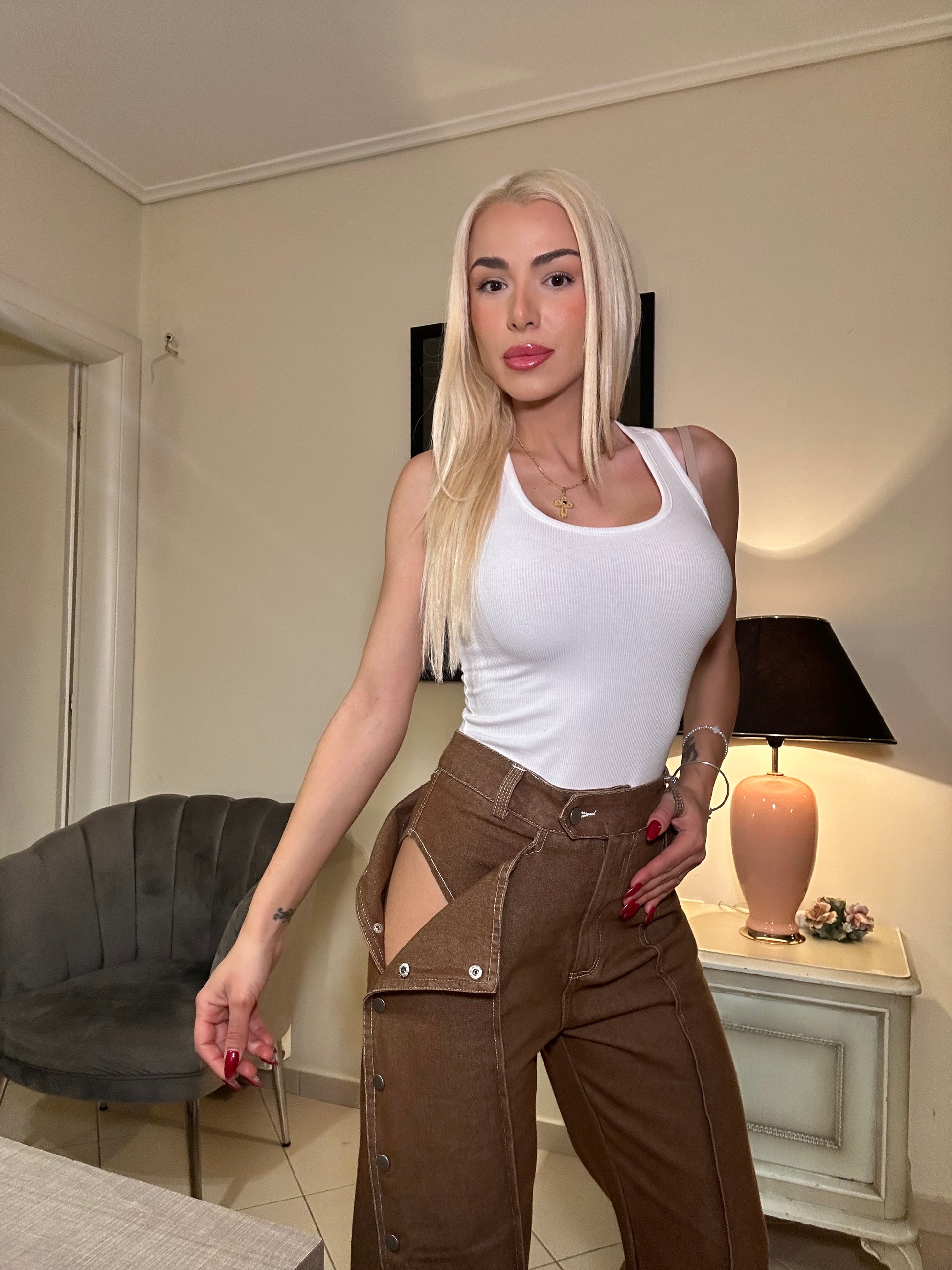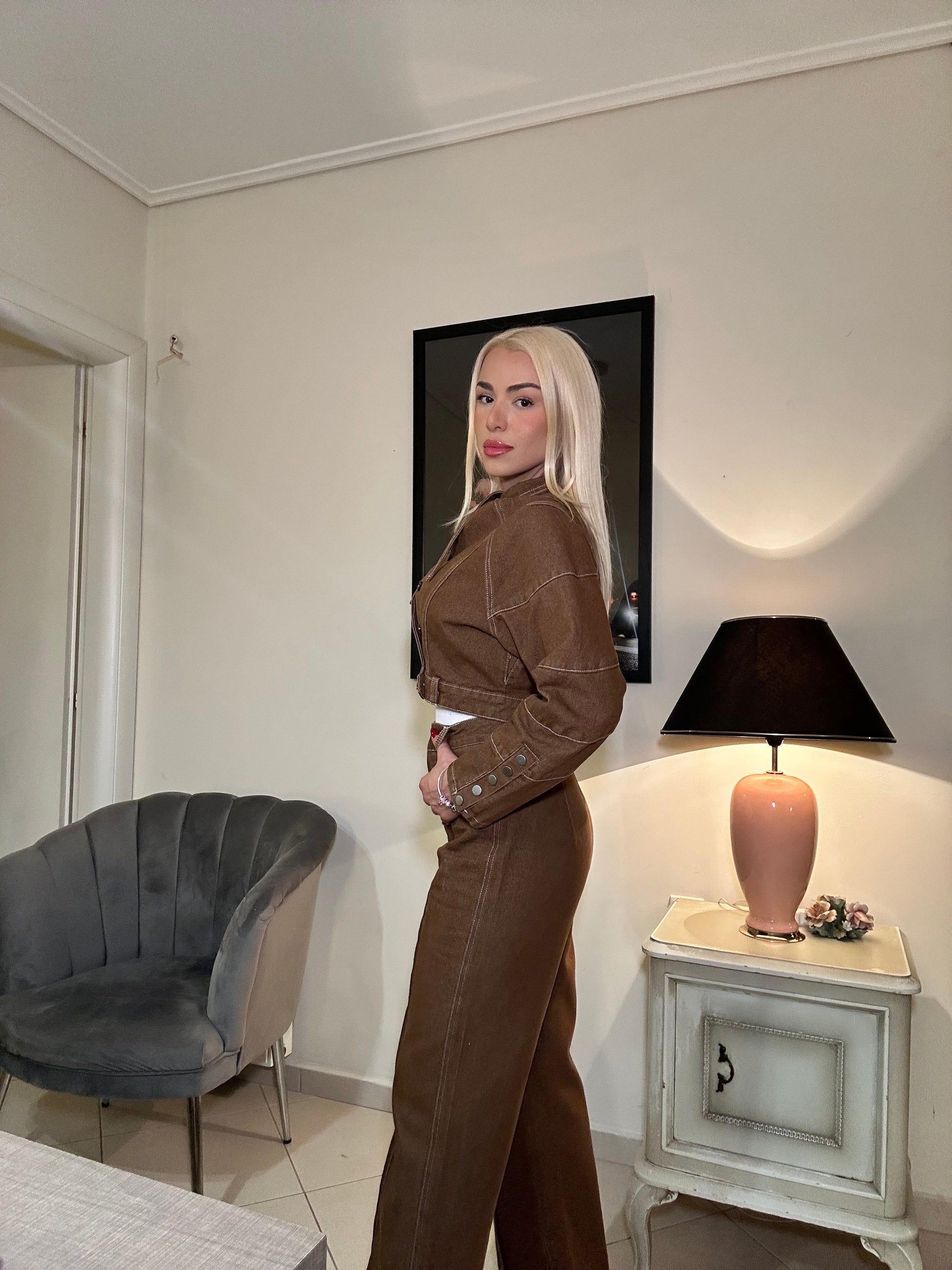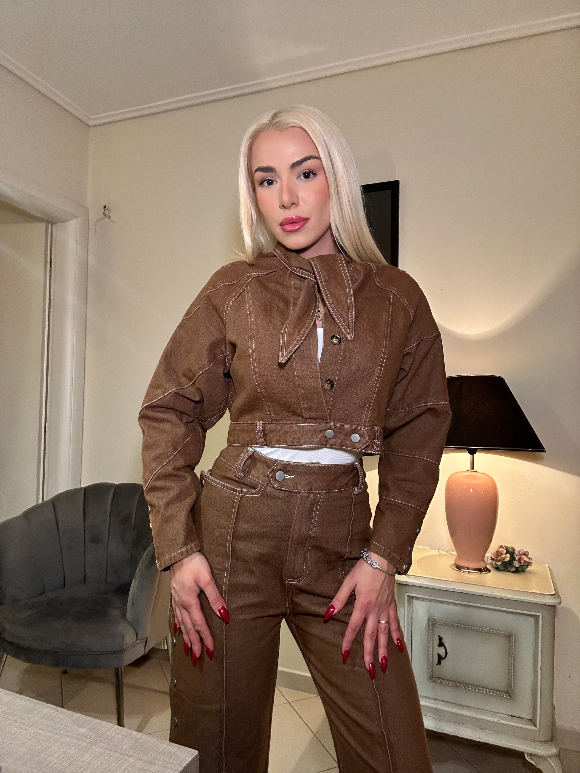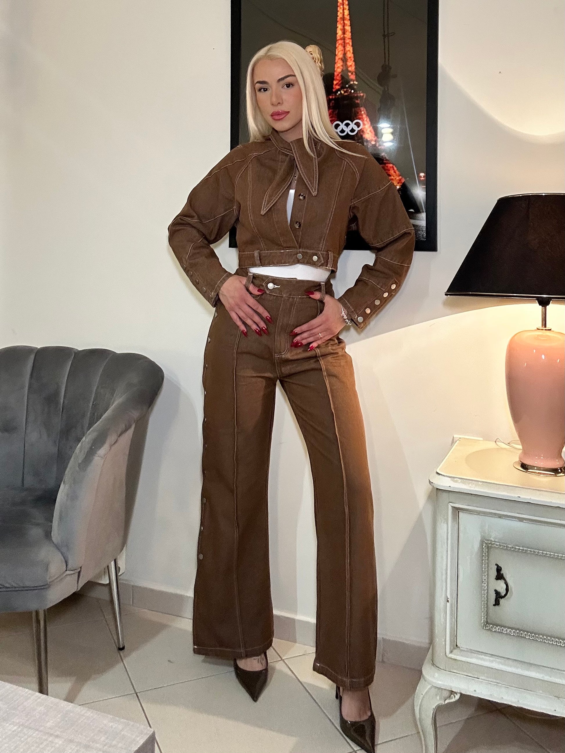 Ένα statement denim σύνολο που δεν περνά απαρατήρητο. Το structured σακάκι με έντονες ραφές και τονισμένους ώμους συνδυάζεται με εντυπωσιακό παντελόνι που φέρει ασύμμετρη σχεδίαση: το ένα μπατζάκι παραμένει κλασικό, ενώ το άλλο ανοίγει πλήρως με κουμπιά, δημιουργώντας ένα τολμηρό “high-cut” εφέ που αναδεικνύει το πόδι. Η σιλουέτα αγκαλιάζει το σώμα, προσφέροντας δυναμισμό, κίνηση και ξεχωριστό χαρακτήρα. Ιδανικό για fashion-forward εμφανίσεις που αποπνέουν αυτοπεποίθηση.