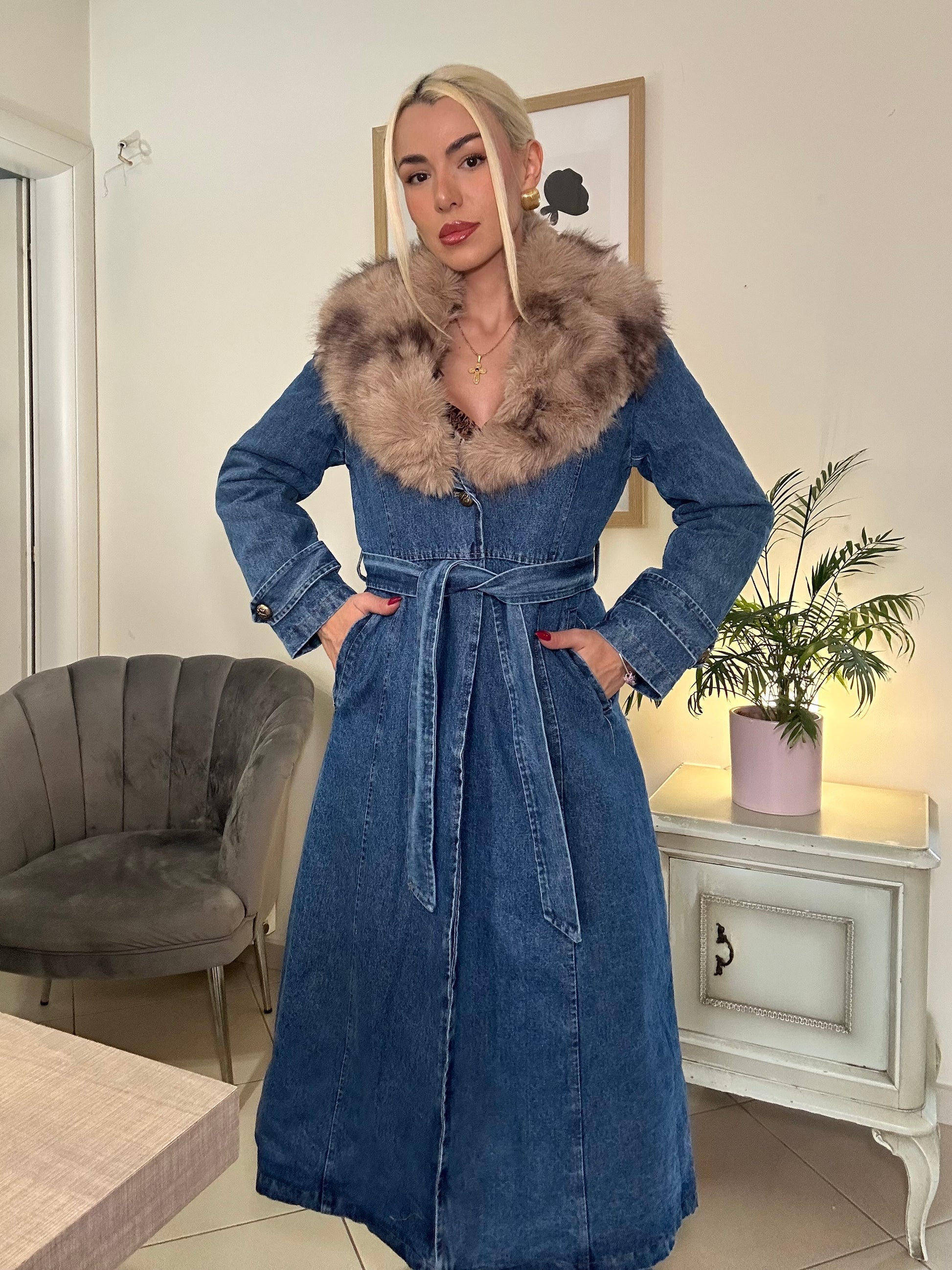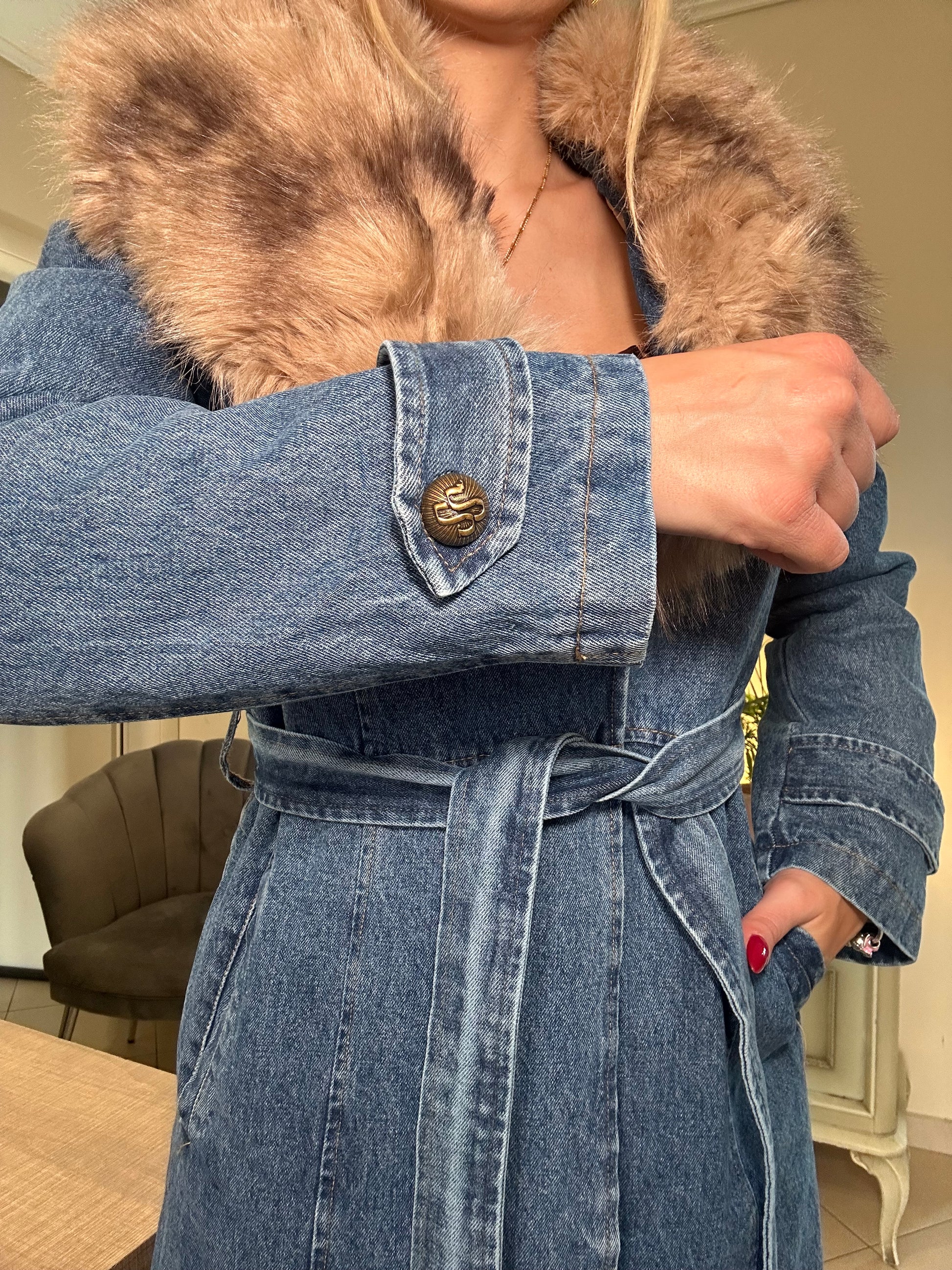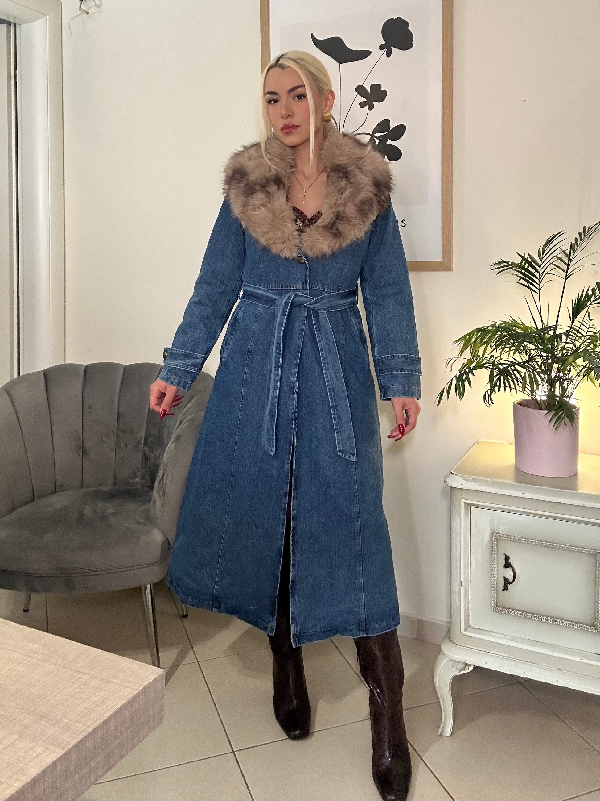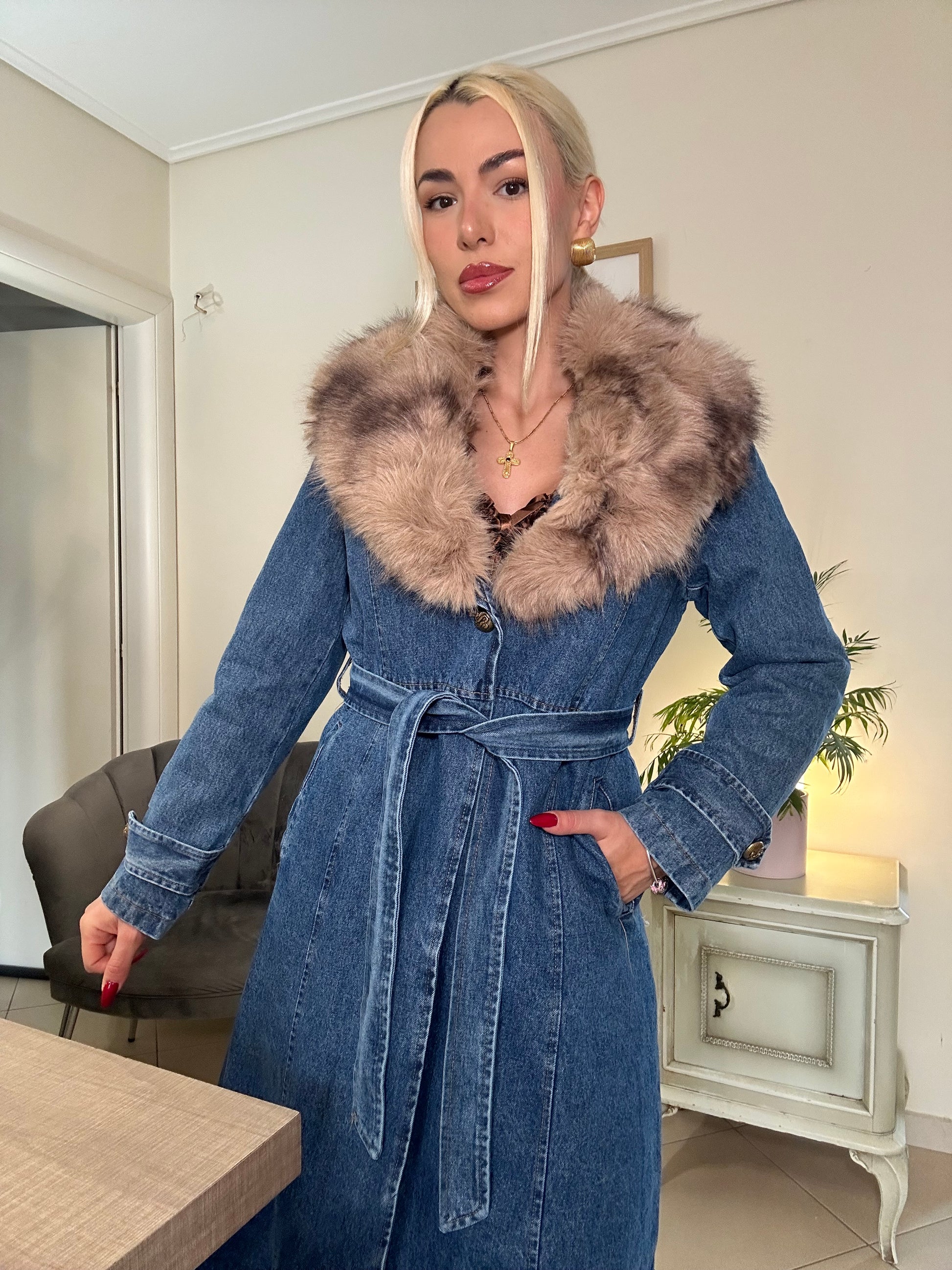 Ένα statement πανωφόρι που επαναπροσδιορίζει την έννοια του σύγχρονου luxury. Το διαχρονικό denim αποκτά νέα διάσταση μέσα από τη δομημένη γραμμή, τη μαλακή εσωτερική επένδυση που προσφέρει αίσθηση παλτού και την αποσπώμενη γούνα στον γιακά – λεπτομέρεια που ισορροπεί ανάμεσα στο διαχρονικό και το θεατρικό.